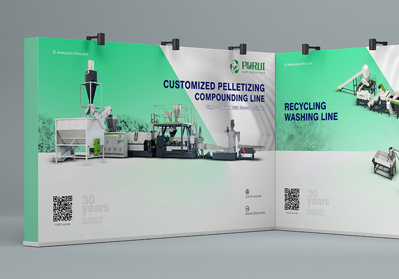 普瑞回收造粒机展板海报设计制作,早晨设计针对国内外不同展会面积及便携性,配置不同海报展板的设计和材质。