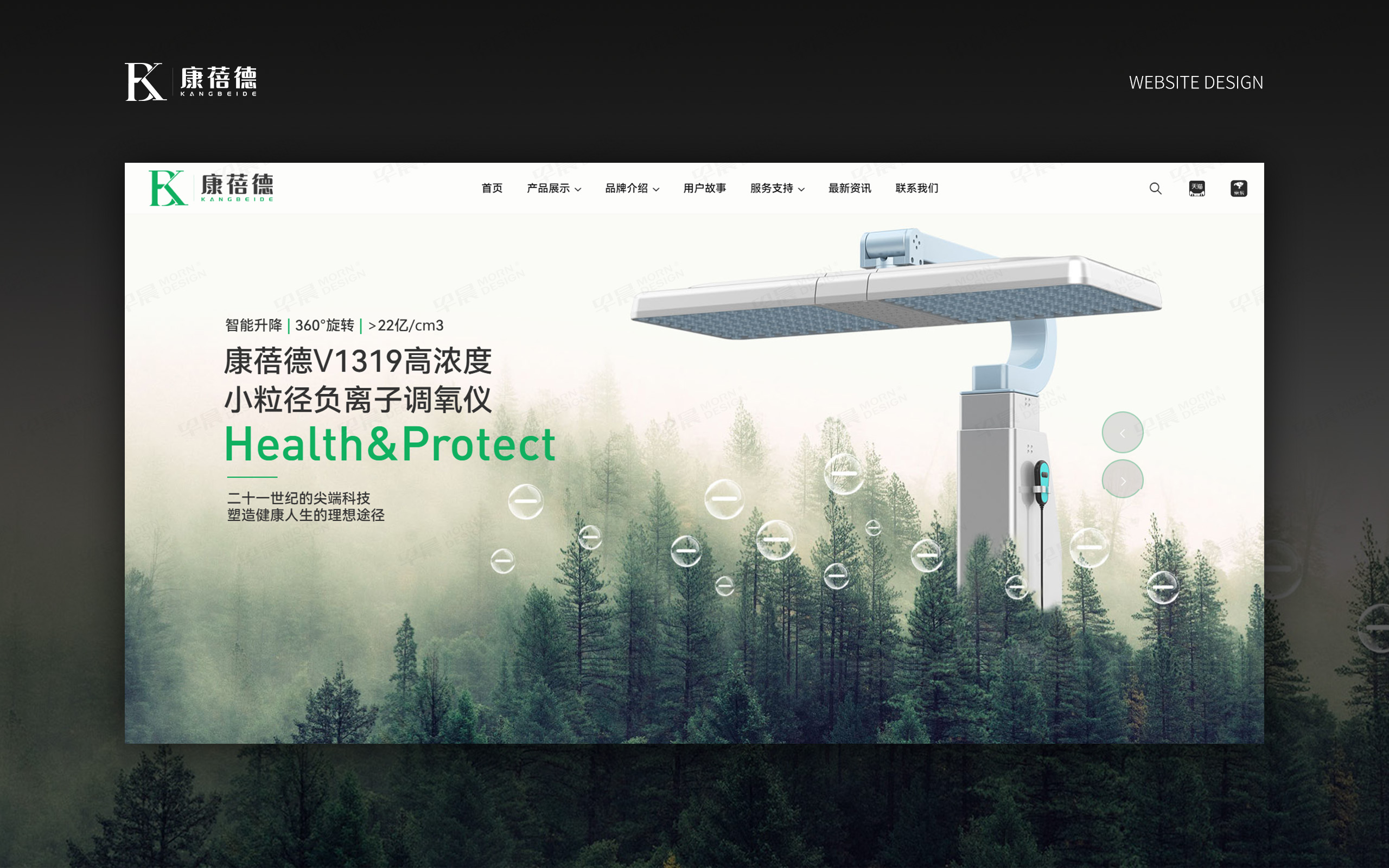 【康蓓德负离子品牌官网设计】苏州康蓓德负离子调氧仪是针对康养行业的一款商用设备。双方经过多轮网站UX规划,用大自然的元素作为网站设计的妆点。产品图多采用三维渲染图,用于匹配大自然元素的角度,网站UI设计让产品和自然元素的融合,让网站设计体现了产品的功能特点。